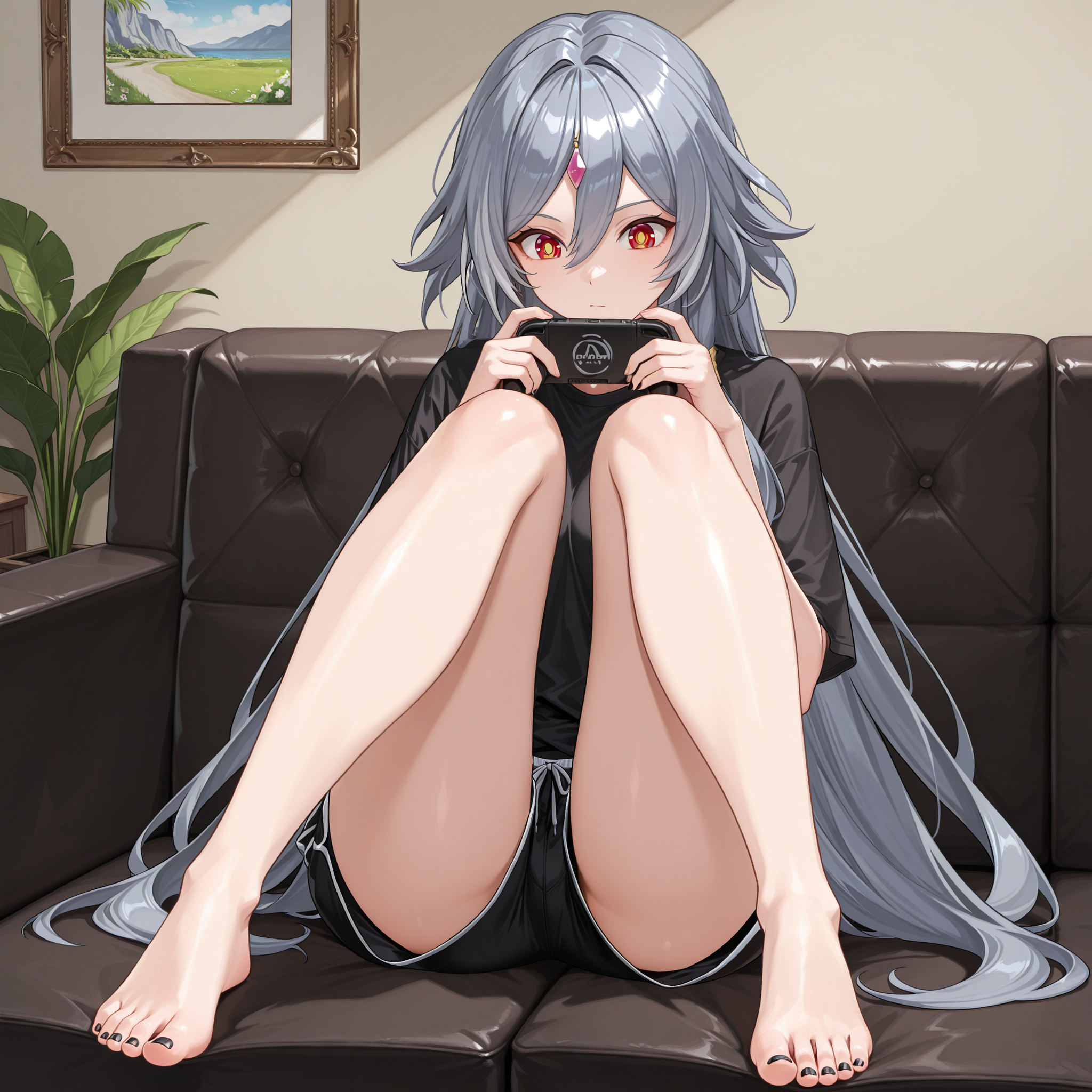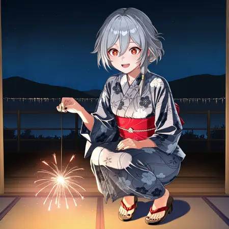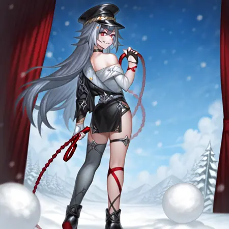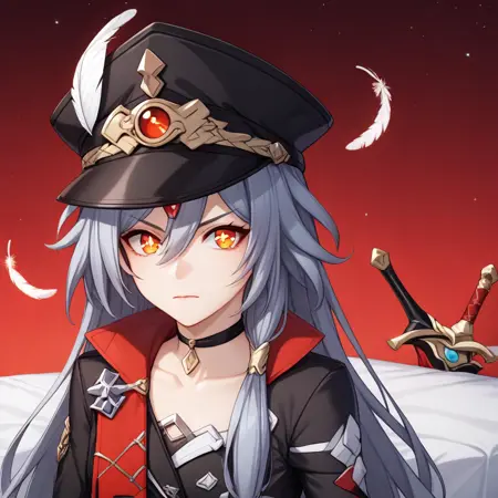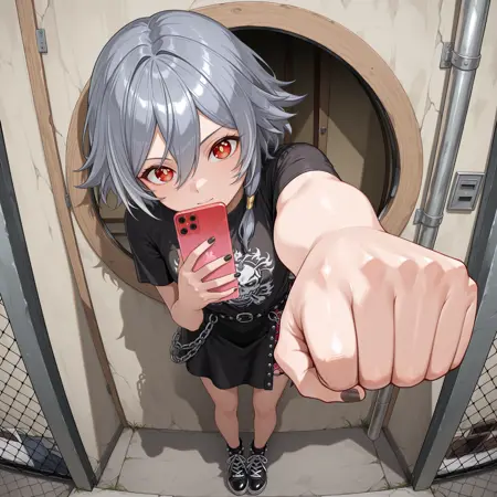 | 训练词汇 | red eyes, grey hair, yellow pupils, hair between eyes, long hair, black nails,已复制! streaked hair, multi colored hair已复制! Chinese Clothing, fingerless gloves, asymmetrical gloves, black footwear, black gloves, chinese clothes, white gloves, boots, dress uneven sleeves, bare shoulders已复制! |