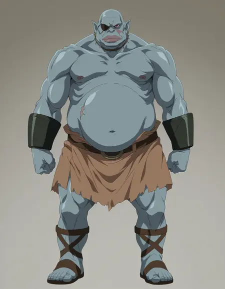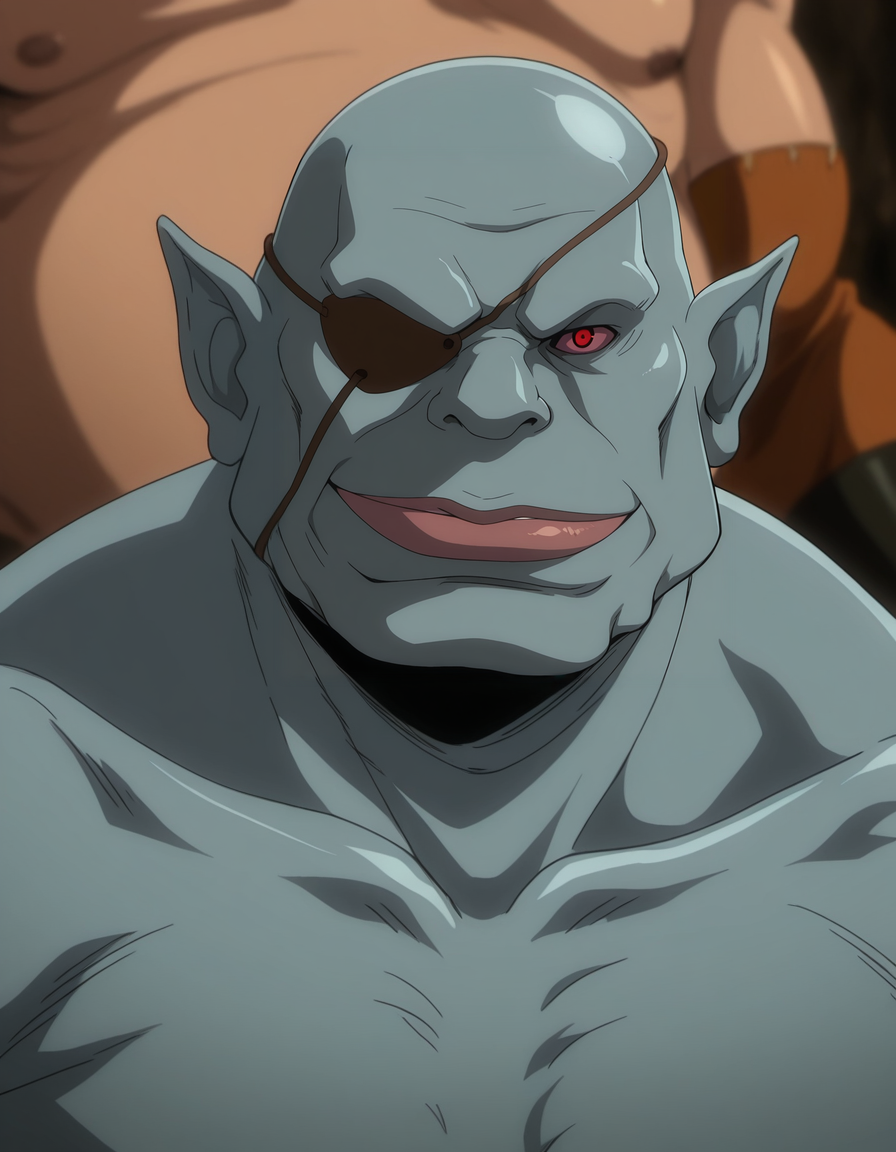 mai_Ikusa,mai_hrungnir,bald,grey_skin,muscular,orc,red_eyes,pointy_ears,lips,tusks,scar,topless_male,eyepatch