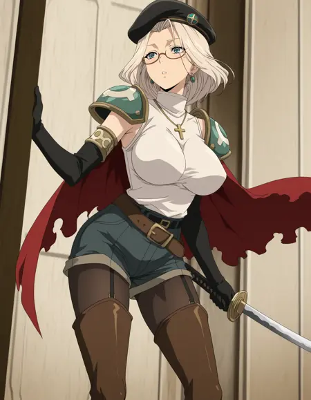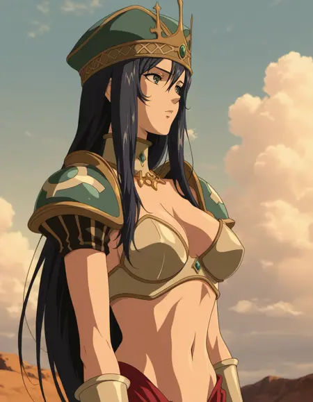 mai_Ikusa,mai_freya,long_hair,black_hair,brown_eyes,lipstick,white_breastplate,cleavage,midriff,white_shoulder_pads,white_gauntlets,white_greaves,skirt,armored_boots,white_boots,white_hat,holding_sword