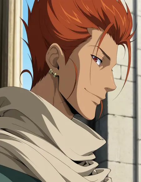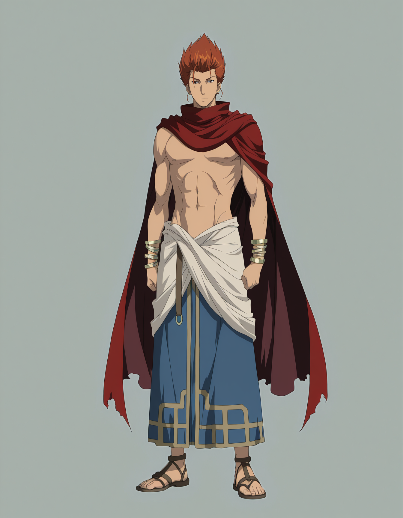 mai_Ikusa,mai_loki,spiked_hair,orange_hair,brown_eyes,cloak,topless_male,cape,cloak,jewelry,earrings,bracelet,sandals,muscular,
