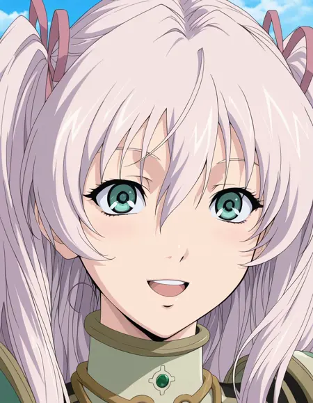mai_Ikusa,mai_suvia,very_long_hair,twintails,pink_hair,green_eyes,armor,brown_armor_skirt,thighhighs,boots,sword