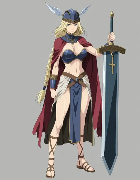 mai_Ikusa,mai_sigurd,long_hair,single_braid,blonde_hair,blue_eyes,large_breasts,winged_helmet,valkyrie,midriff,cleavage,cape,loincloth,roman_sandals,greatsword