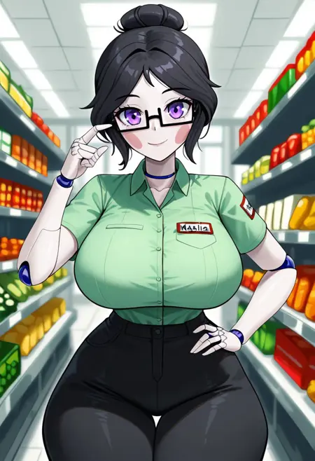 Black Hair, Short Hair, Hair Bun, Purple Eyes, Glasses, Black-Framed Eyewear, Green Shirt, Collared Shirt, Short Sleeves, Black Pants, Blush Stickers, Name Tag, Joints, Robot Joints, Android, Pale Skin