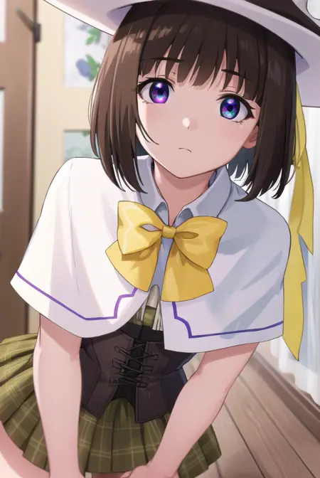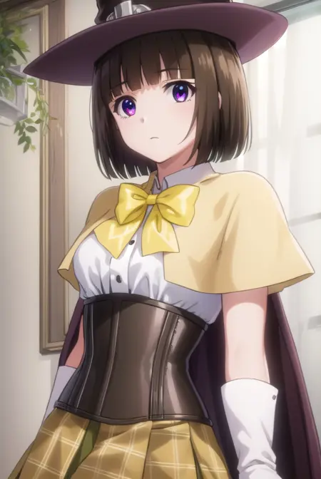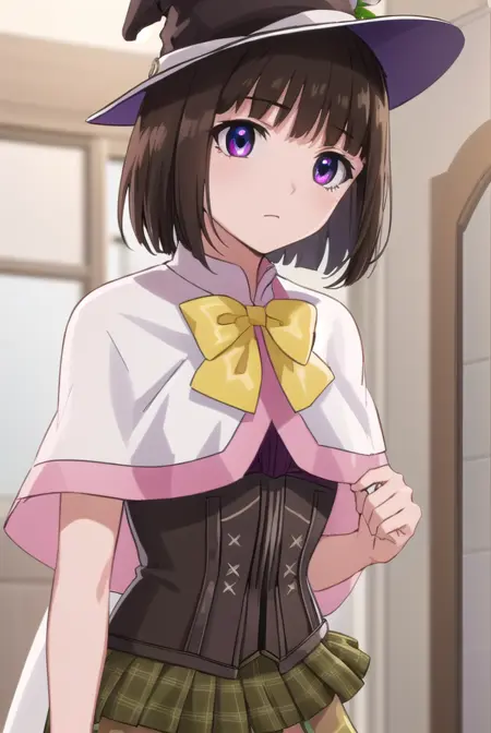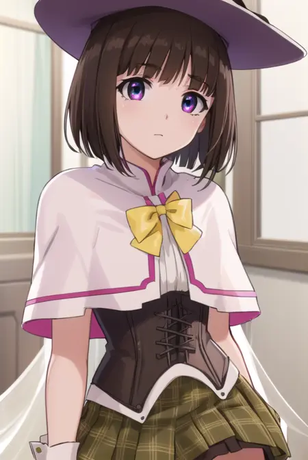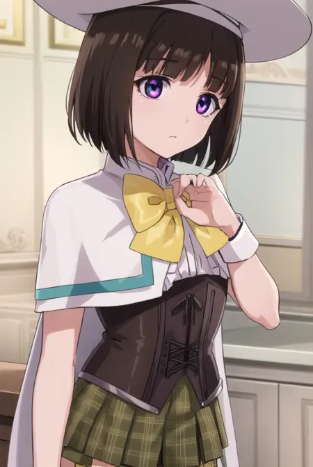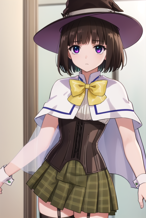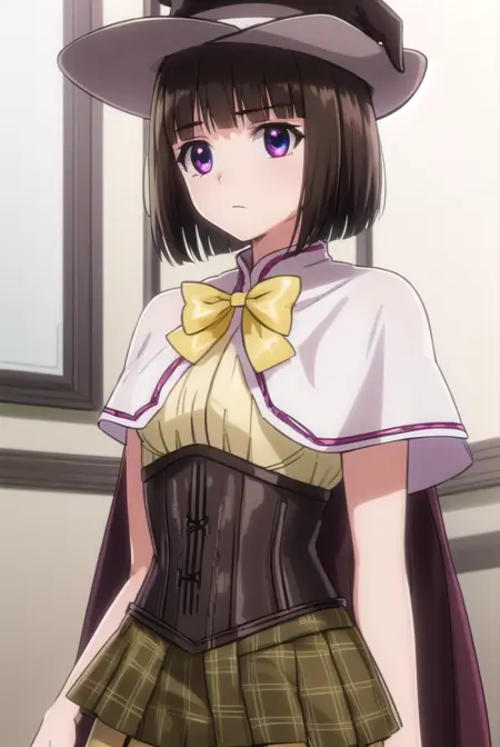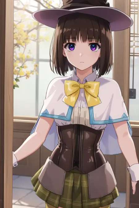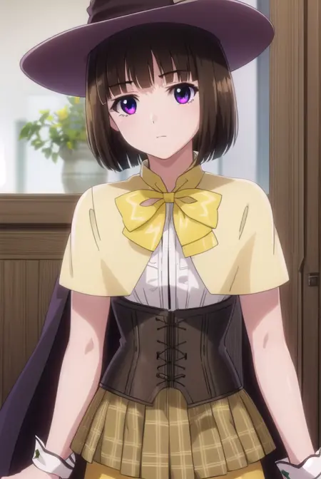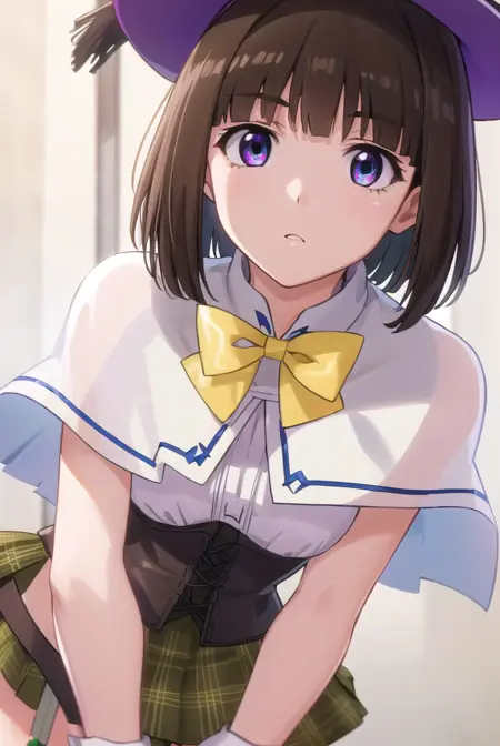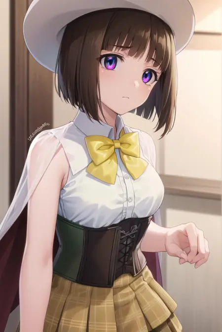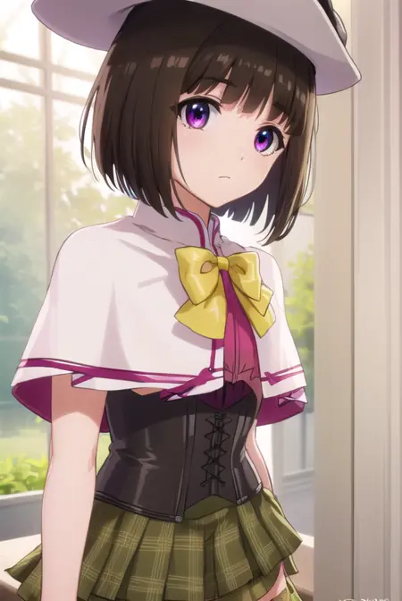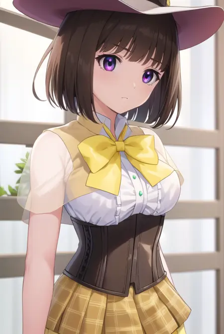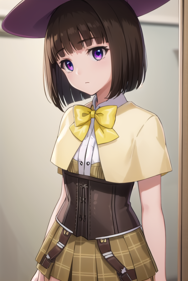 yukari sendou, 단발, (보라색 눈:1.1), 앞머리, 둔한 앞머리, 갈색 머리,