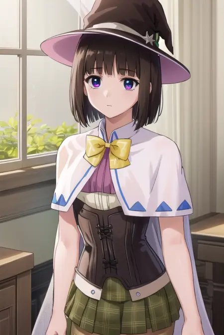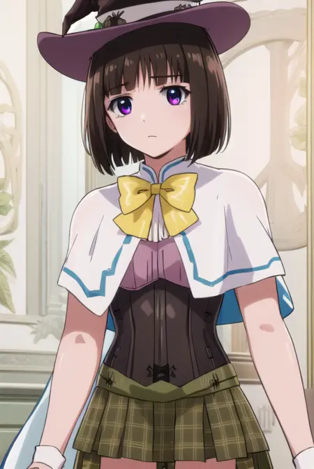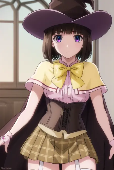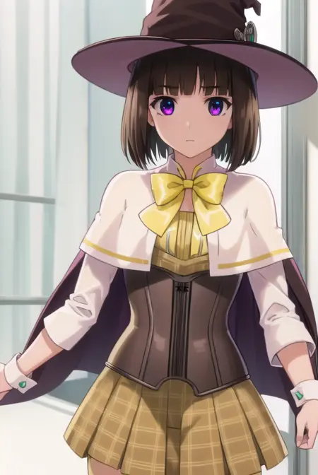 스커트, 허벅지까지 긴 양말, 모자, 학교 유니폼, 망토, 갈색 망토, 흰색 허벅지까지 긴 양말, 마녀 모자, 작은 망토, (흰색 작은 망토:1.5), 리본, (노란 리본:1.5), 주름스커트, (녹색 스커트:1.5), 코르셋, (갈색 코르셋:1.5),