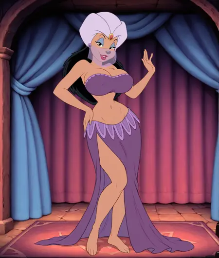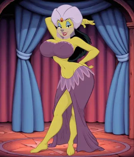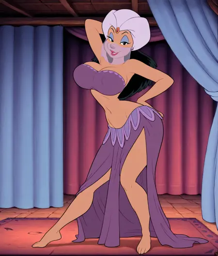 | 训练词汇 | map_girl, toon (style), flat color, black hair, long hair, black eyes, original, narrow waist, 1girl,已复制! tube top, purple tube top, red lips, turban, purple skirt, flowing skirt, blue eyeshadow, huge breasts, mouth veil,已复制! yellow skin, old style,已复制! |