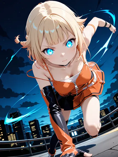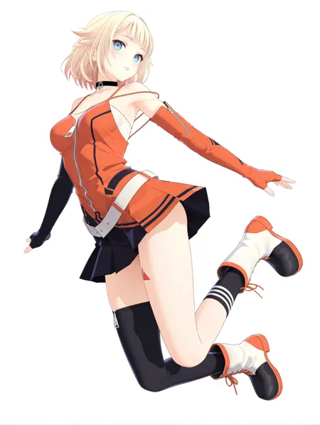 의상: o_clothes, choker, bare shoulders, two-tone dress, spaghetti strap, zipper pull tab, single elbow glove, orange dress, asymmetrical legwear, single thighhigh, single kneehigh, uneven legwear, boots,