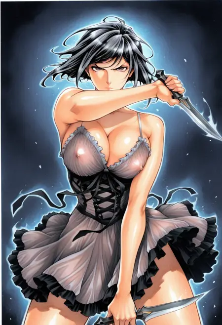 This is Akari Kuroki from Black Joke manga by Rintaro Koike and Masayuki Taguchi. Specifically her later appearances in volume 8 and up with more complicated hair that never stay still. She has many outfits but I only specifically tagged three (from volume 8)