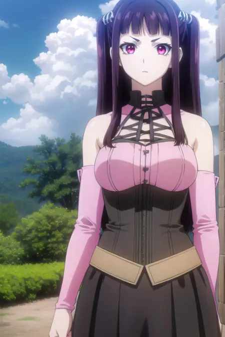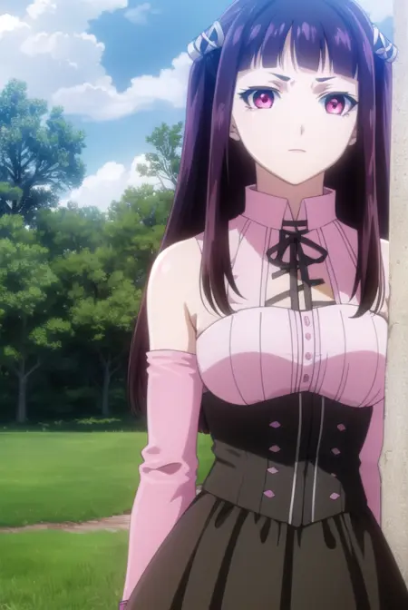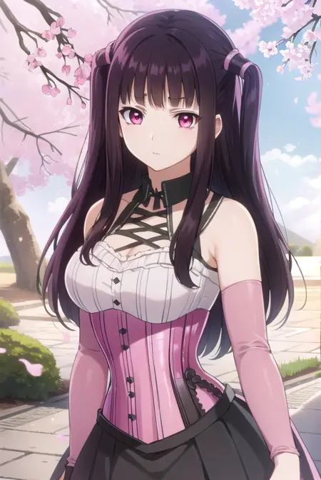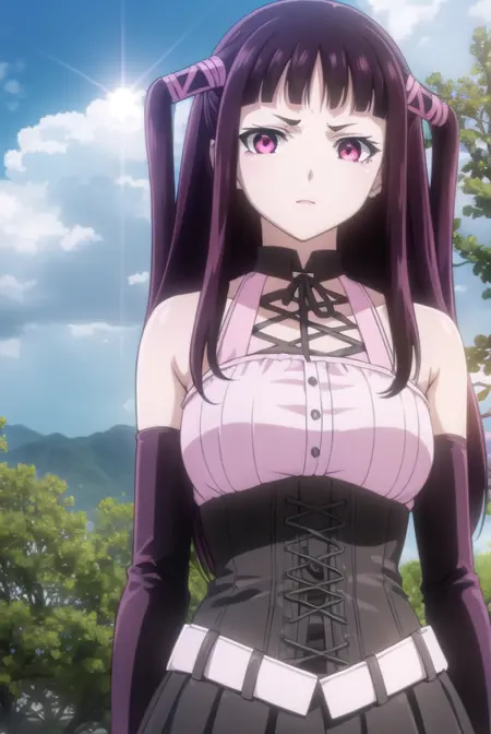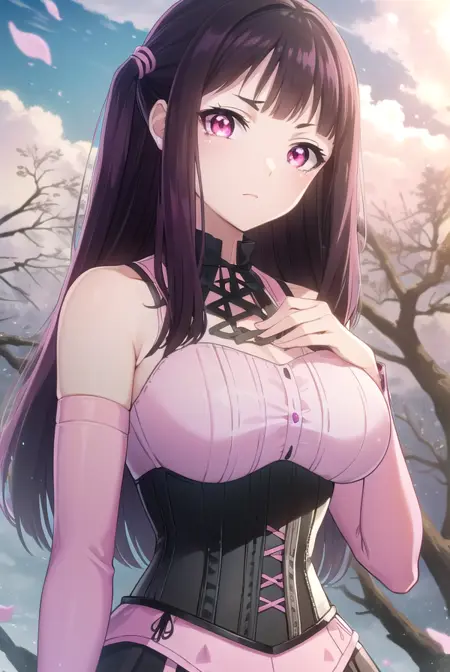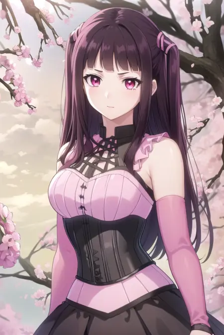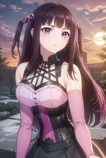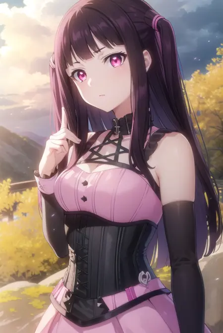 藤堂露比,长发,黑发,(粉红色眼睛:1.5),两侧发束向上,刘海,齐刘海,
