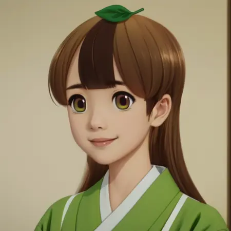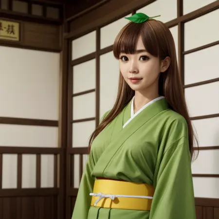 green kimono, (white tabi, white obijime, yellow obi, zouri, han'eri, red obiage,)