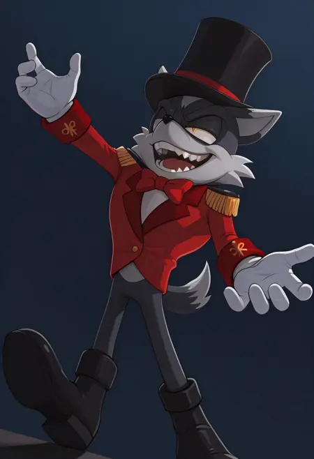 Barker, furry, dark gray fur, gray muzzle, yellow eyes, dark gray tail, black top hat, red suit, red bowtie, black and gold shoulderpads, white gloves, black shoes