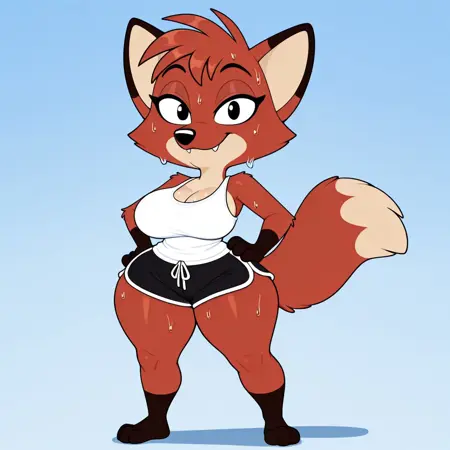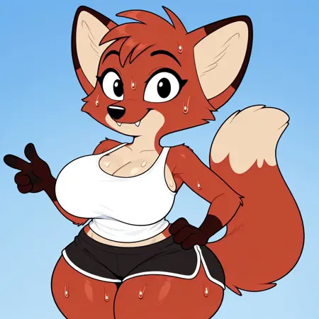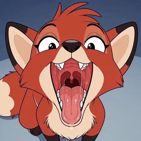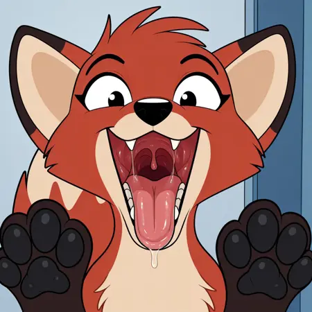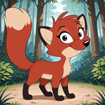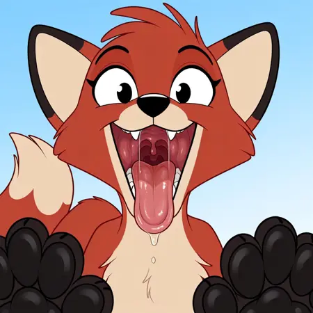 fox, red fox, red and tan fur, black eyes, black nose, black paws, bushy fox tail, fangs,