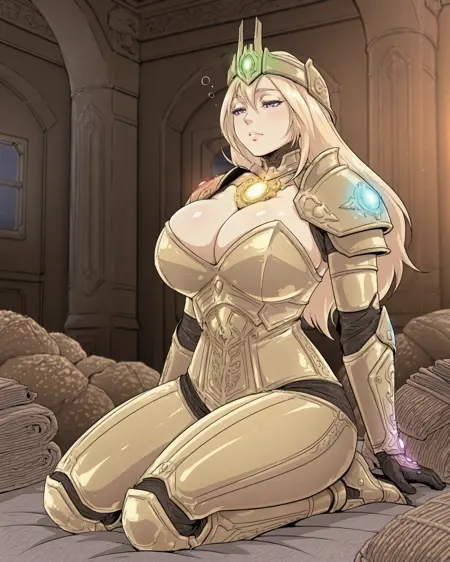 Trigger: Inf1n1tyG1rl, 1girl, blonde hair, long hair, purple eyes, cleavage, gold armor, power armor, breastplate, shoulder armor, gauntlets, pauldrons, glowing