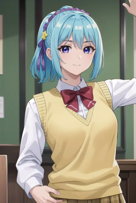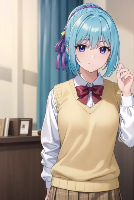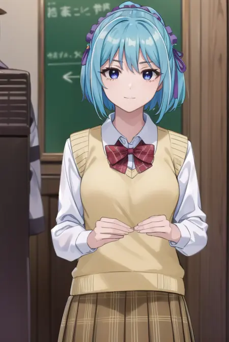 kurumu kurono, short hair, blue hair, (purple eyes:1.1), ponytail, ribbon, hair ribbon, hair ornament,