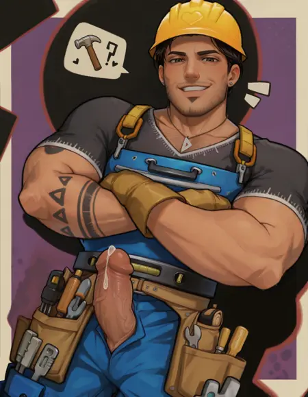 tools, grey shirt, hardhat, Gloves, necklace, overalls, belt