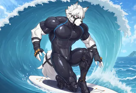 VL_Wetsuit, black wetsuit, white fur, red eyes, eyepatch, fingerless gloves, cybernetic legs