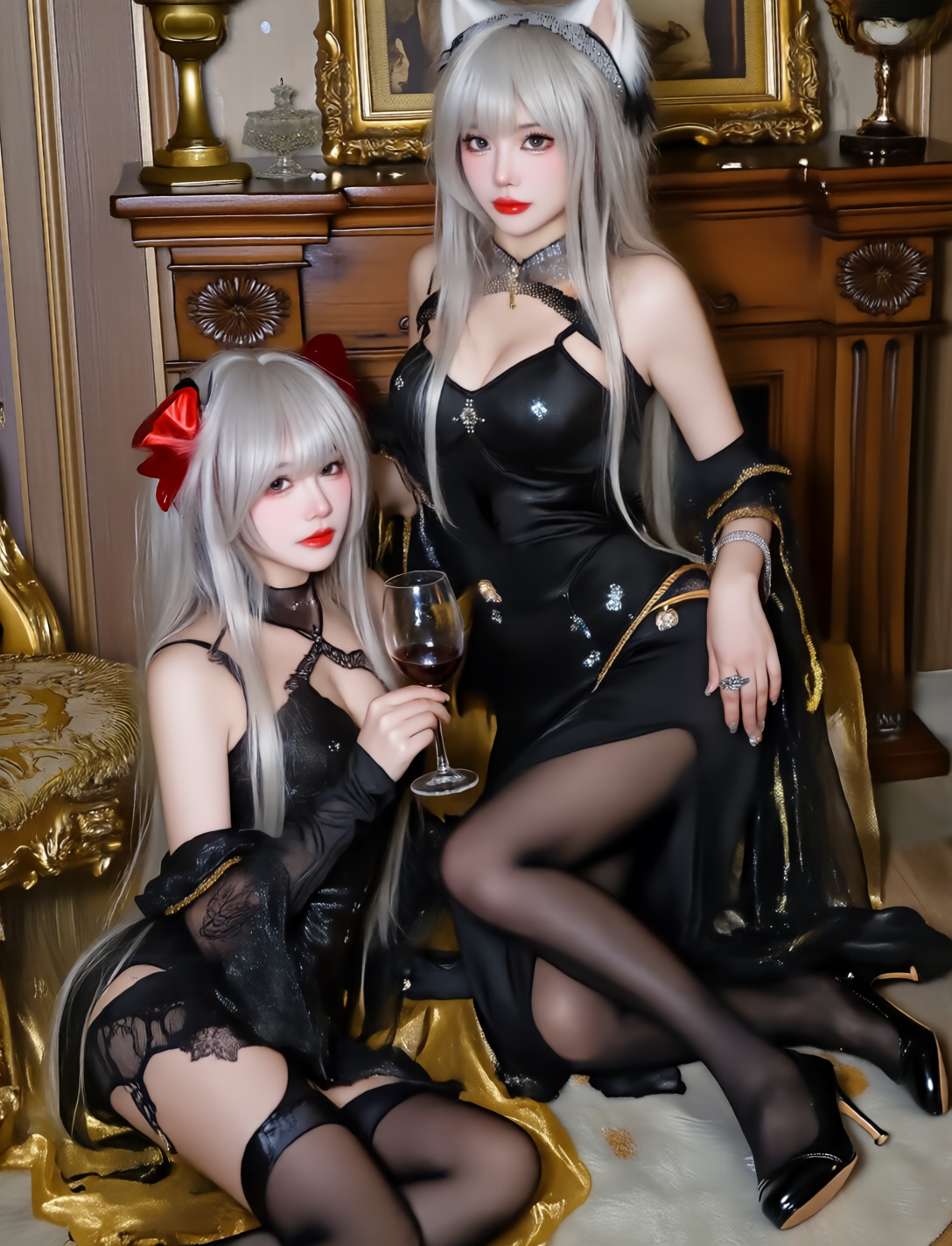 - 家具と装飾: 背景には豪華な木製キャビネットがあり、その上にはさまざまな装飾品とワイングラスが置かれています。キャビネットの横には金色の鏡があり、その上には赤いカーテンが飾られています。また、背景には豪華なシャンデリアがあり、温かい光を放ち、温かみのある雰囲気を演出しています。