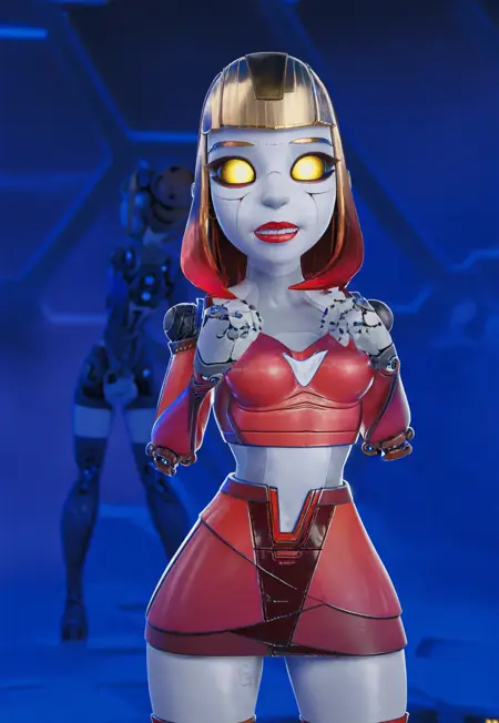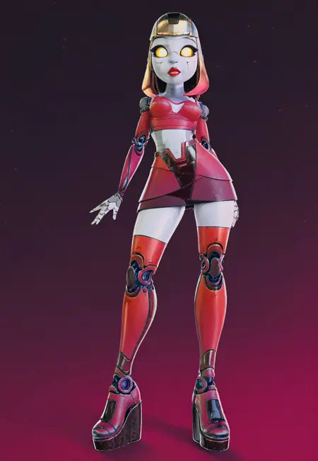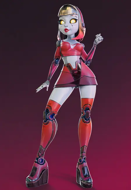 | 训练词汇 | 1girl, female robot, humanoid robot, android, slim body, curvy, gray skin, porcelain texture, robotic joints, mechanical details, robotic hands, glowing yellow eyes, short bob haircut, straight hair, golden hair, shiny hair, doll-like face, red lipstick, metallic red crop top, metallic red mini skirt, metallic red thigh-high boots, metallic red high heels已复制! |