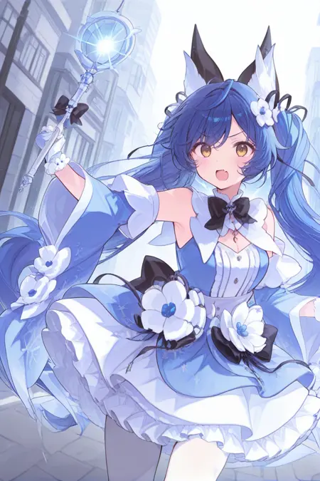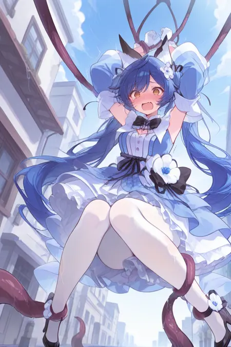 服装:动物耳朵,白色手套,高跟鞋,黑色鞋履,分离袖子,振袖,花边,发饰花,发带,白色连裤丝袜,蓝色连衣裙,花边裙,白花,黑色蝴蝶结,长袖,