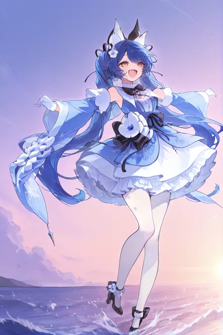 服装:动物耳朵,白色手套,高跟鞋,黑色鞋履,分离袖子,振袖,花边,发饰花,发带,白色连裤丝袜,蓝色连衣裙,花边裙,白花,黑色蝴蝶结,长袖,