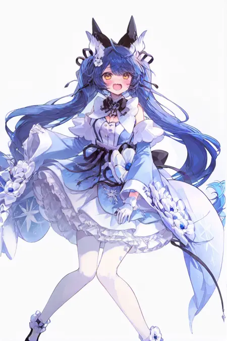 衣装: 動物の耳、白い手袋、ハイヒール、黒い靴、脱ぎ取り式の袖、振袖スタイルの袖、フリル、髪の花、髪のリボン、白いパンティストッキング、青いドレス、フリル付きドレス、白い花、黒いリボン、長袖、