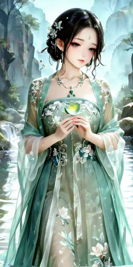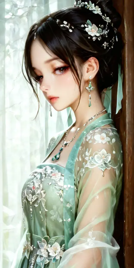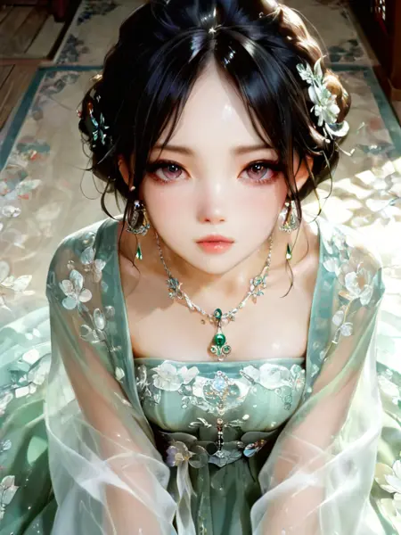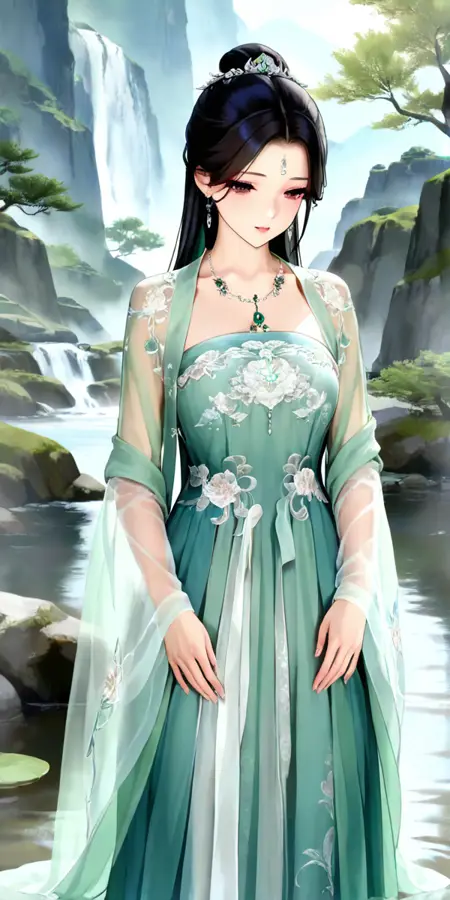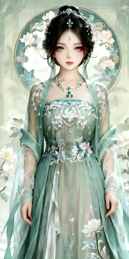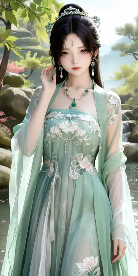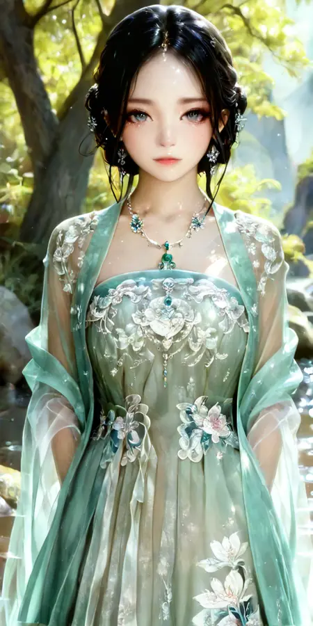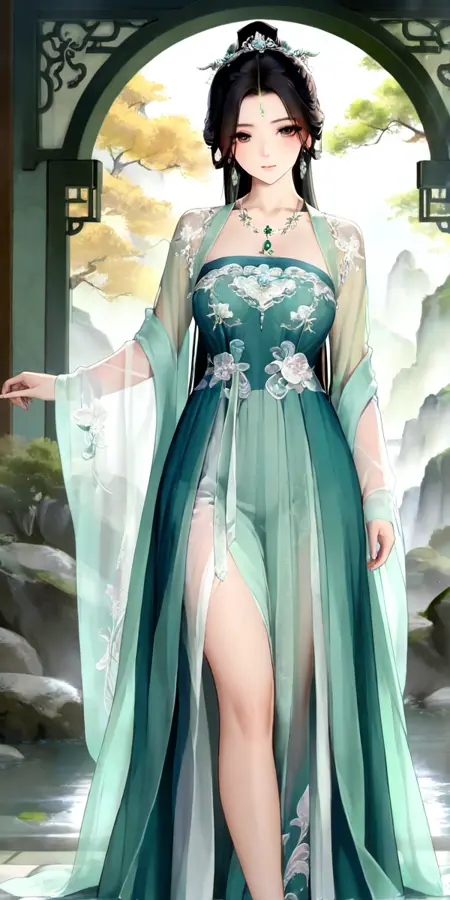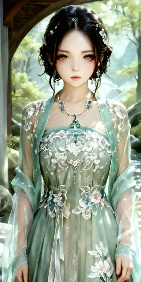 Prompt word: hanfu, dress, green dress, necklace, jewelry, see-through
