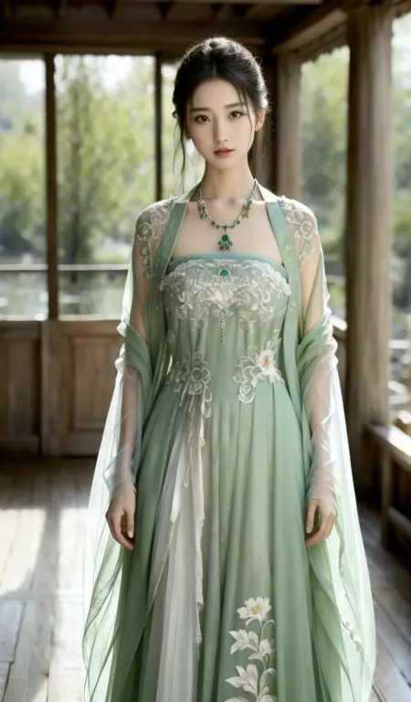 提示词:hanfu、裙子、绿色裙子、项链、珠宝、透视