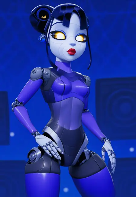 1girl, android, robot girl, humanoid, slim body, curvy, robotic joints, mechanical arms, mechanical legs, metallic body, exposed machinery, cybernetic details, glowing yellow eyes, pale face, gray skin, smooth faceplate, red lips, black hair, twin buns hairstyle, bangs, futuristic design purple bodysuit, black bodysuit, form-fitting suit, thigh-high boots, segmented armor, metallic textures,