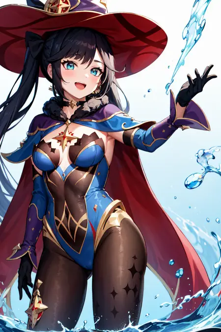 衣装1(デフォルト)aamona, long hair, twintails, hair ornament, black ribbon, earrings, witch hat, purple headwear, choker, cape, fur trim, gold trim, blue leotard, detached sleeves, gloves, pantyhose