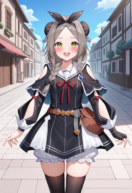 - afirsai, bow hairband, hair bow, black bow, bun with braided base, double bun, black bun cover, sailor dress, white sailor collar, red ribbon, black dress, capelet, long sleeves, arm cutout, single glove, fingerless gloves, belt pouch, bloomers, black thighhighs,
