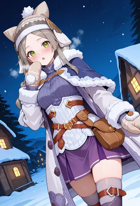 - afirsno, earflap beanie, fur-trimmed capelet, blue capelet, winter coat, pom pom \(clothes\), ribbed sweater, blue sweater, multiple belts, pouch, ribbed corset, white corset, purple skirt, mittens, thighhighs, thigh belt,