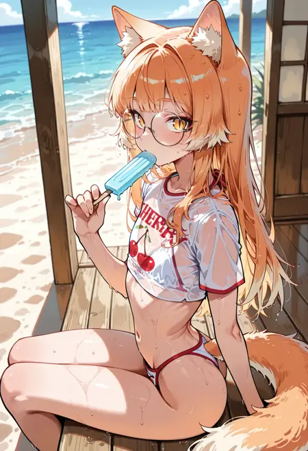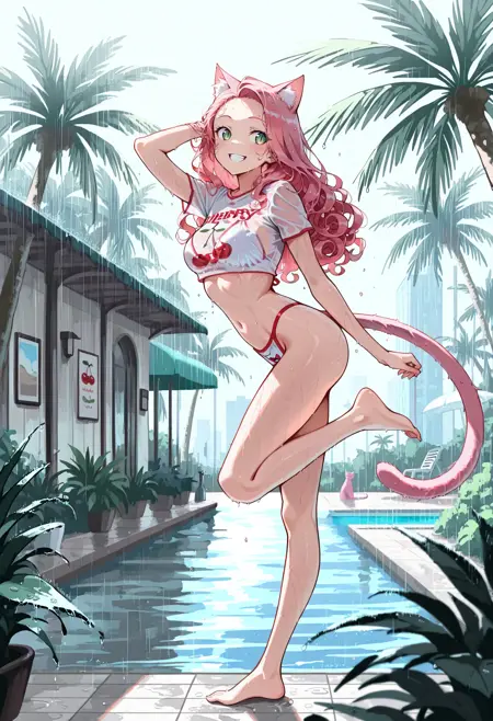 트리거 단어: var1e1n3archerrypr1n1, 흰색 비키니, 빨간 트림 비키니, 체리 프린트 팬티, 프린트 팬티, cherry_text, 텍스트 팬티, 수영복, 비키니, 배꼽, 투명 셔츠, 크롭 셔츠, 짧은 소매 셔츠, 체리 프린트 셔츠, 텍스트 셔츠,