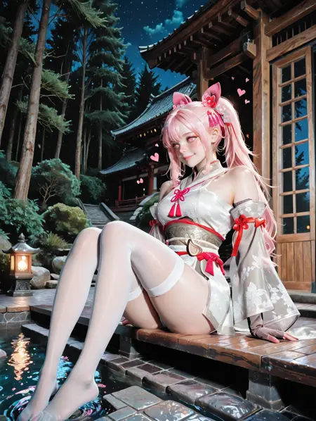 - no underwear,sideless outfit,no panties,sideboob,areola,white kimono,fingerless gloves,ribbon,see-through,sash,short kimono,white thighhighs,wide sleeves,zouri,bare shoulders,
