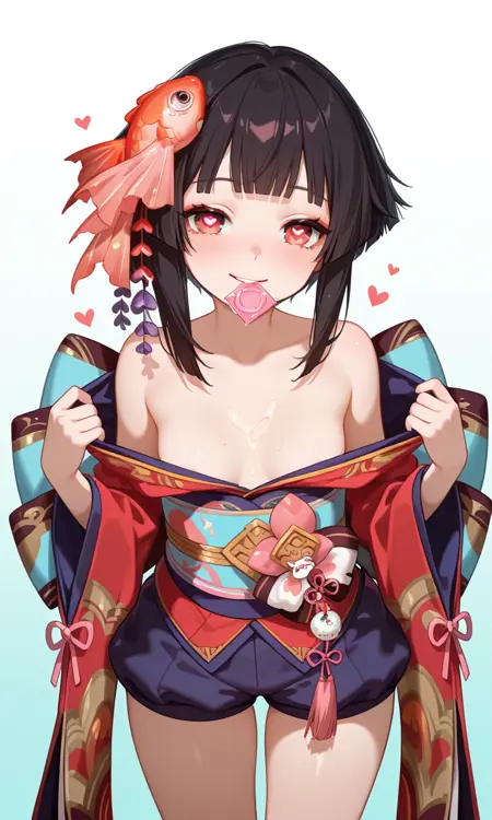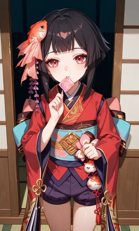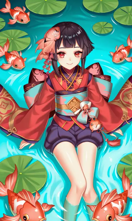 Kagura_onmyoji, short hair, black hair, blunt bang, red eyes, hair ornament, goldfish hairpin, kimono, shorts, sash, obi