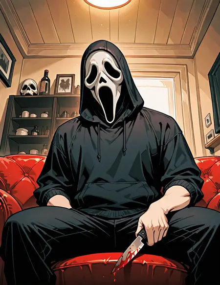 ghostface, solo, 1boy, navel, nipples, male focus, nude, artist name, hood, stomach, muscular, mask, thick thighs, abs, muscular male, pectorals, bara, large pectorals, cloak, convenient censoring, hood up, bare pectorals, out-of-frame censoring, hooded cloak, black cloak, black robe, covered face, skull mask, penis peek, coat, naked coat, naked cloak