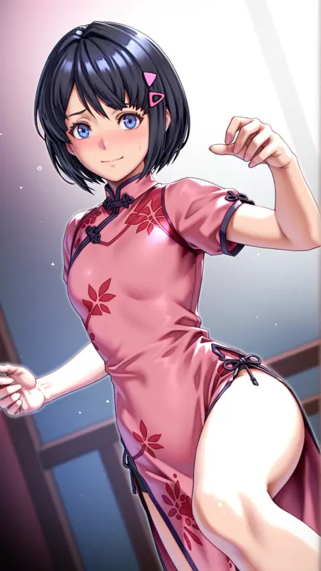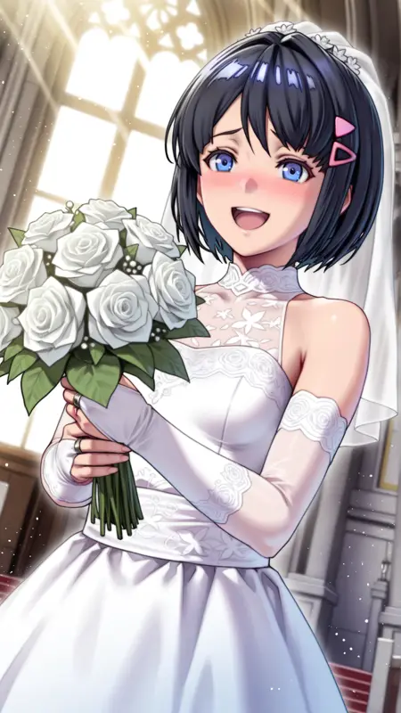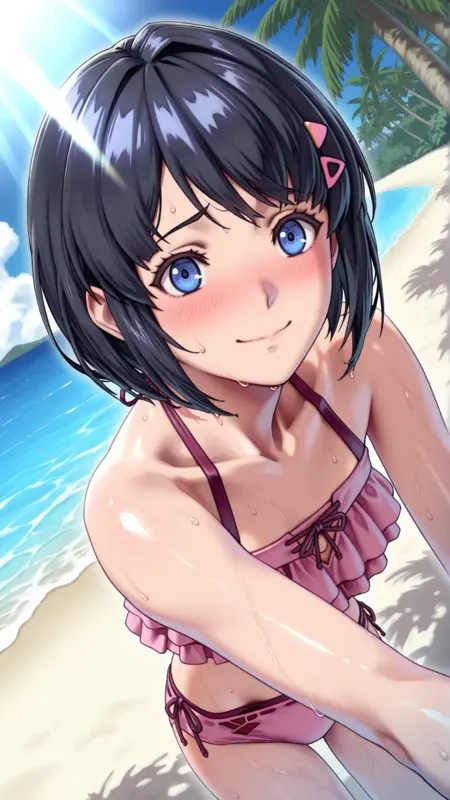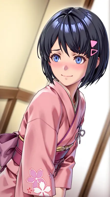 Appearance:short hair, black hair, hairclip, blue eyes, triangle hair ornament, bob cut, hair behind ear,