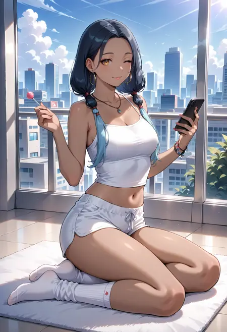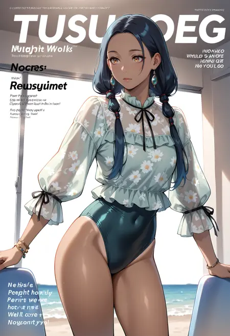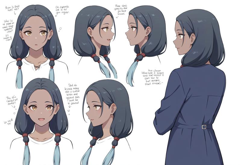 外观: 1个女孩,黄色眼睛,棕色眼睛,蓝发,黑发,长发,双马尾,刘海,耳后头发,多股绑发,低马尾,低双马尾,头发垂过肩膀,深色皮肤,深肤色女性