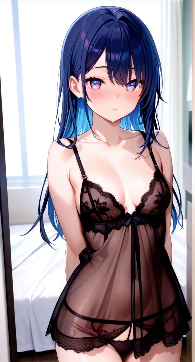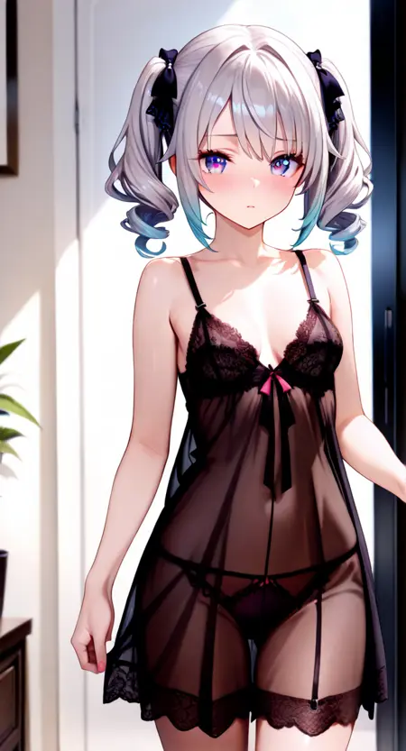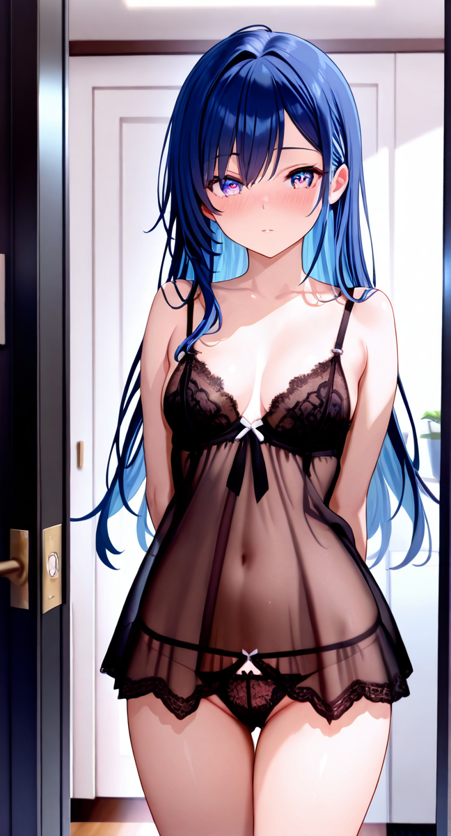 프롬프트 단어: black-lace-pajamas, lingerie, black panties, small breasts, see-through, collarbone, babydoll, bra