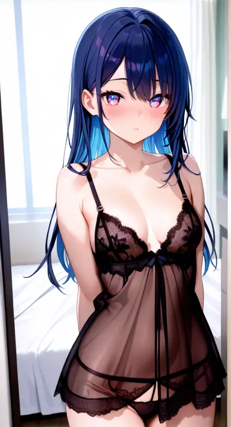 Prompt word: black-lace-pajamas, lingerie, black panties, small breasts, see-through, collarbone, babydoll, bra