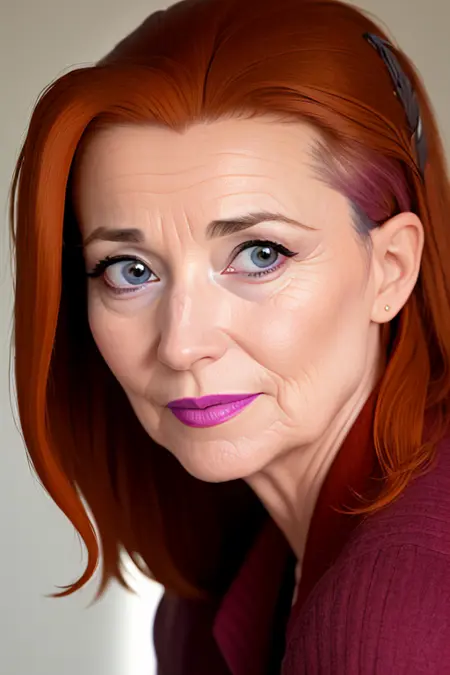 Additional helpful tags are: auburn hair, lipstick, hoodie