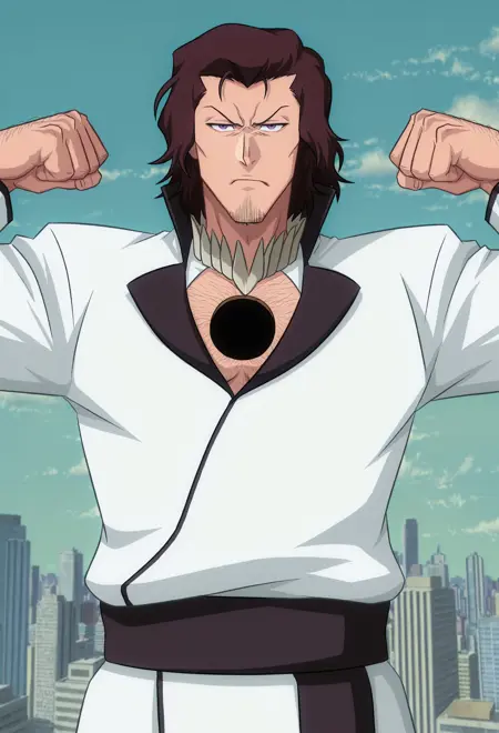 BleachStarrk, goatee, brown hair, white robes, hole in chest