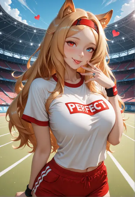 女仆(变体): 1girl (Arknights_Archetto, Arknights_Archetto 替代服装, 长发, 胸部, 凝视观众, 脸红, 微笑, 蓝眼, 金发, 大胸部, 衬衫, 红眼, 动物耳朵, 饰品, 闭嘴, 白色衬衫, 短袖, 心形, 中景, 发带, 户外, 天空, 短裤, 白天, 伸出舌头, 举手, 伸舌, 手链, 蓝天, 异色瞳, 戒指, 手环, 衣服文字, 健身服, :q, 红色短裤, 健身短裤, 体育场, Arknights_Archetto 深金色头发, Arknights_Archetto 异色瞳, Arknights_Archetto 狮耳)