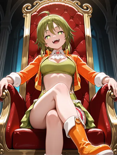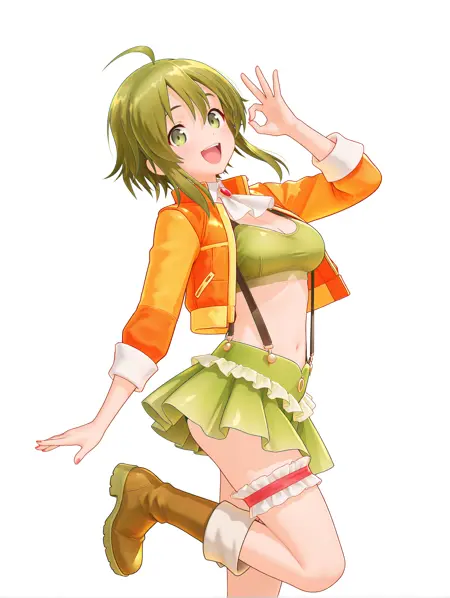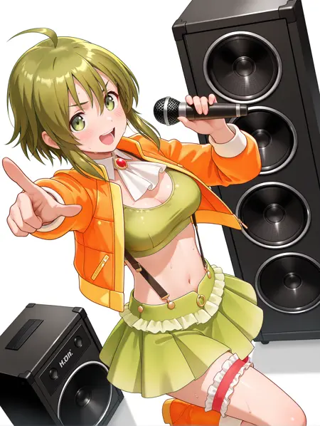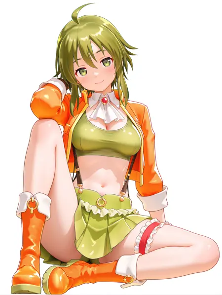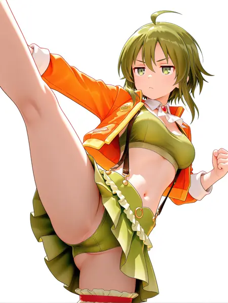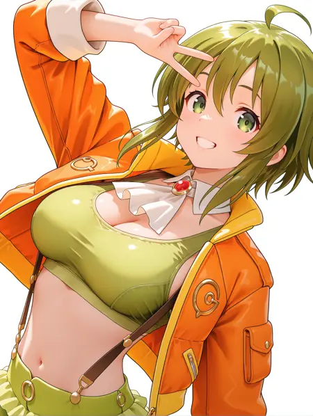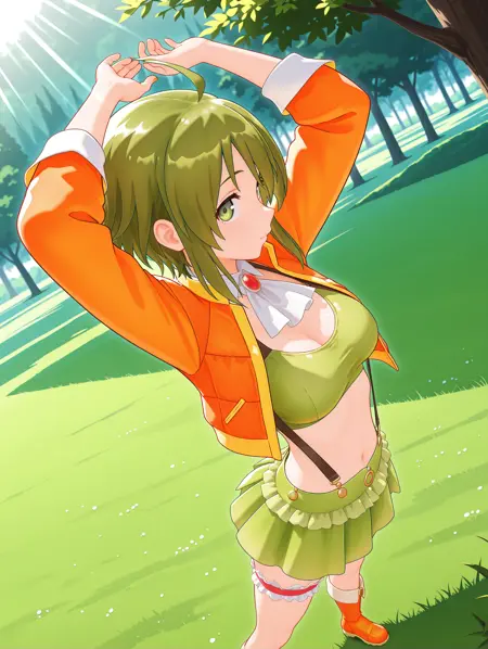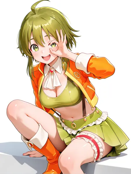 服装:g_clothes, white ascot, brooch, open jacket, orange jacket, green sports bra, crop_top, suspender_skirt, bridal garter, orange footwear, boots,