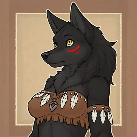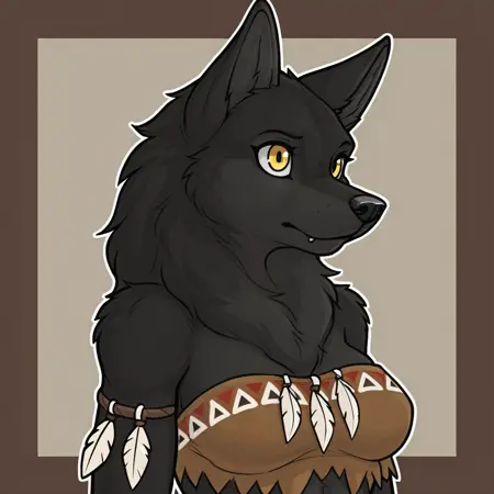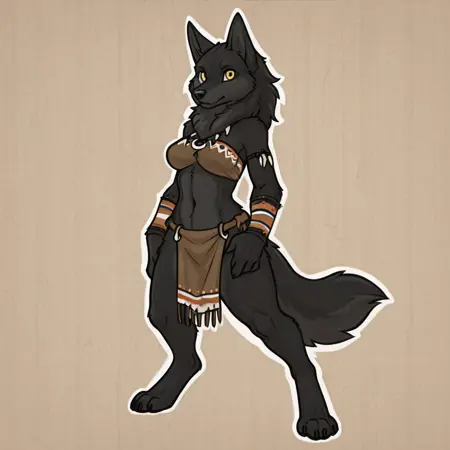 furry, wolf, female, neck tuft, black fur, yellow eyes, tribal outfit, dense fur, medium breasts, full body