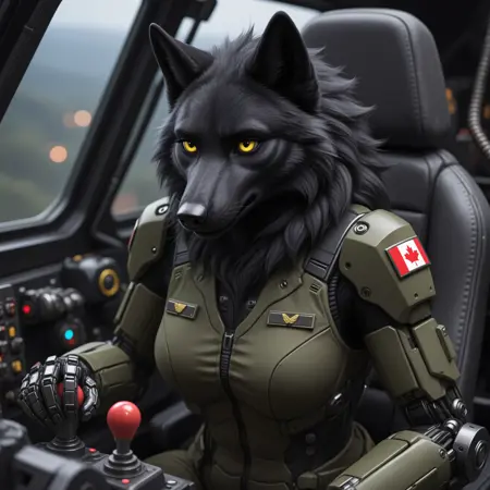 毛茸茸的,狼,雌性,颈毛簇,黑色身体,黄眼睛,部落服饰,森林,浓密毛发,中等大小乳房,长狼嘴,蓬松腋毛
