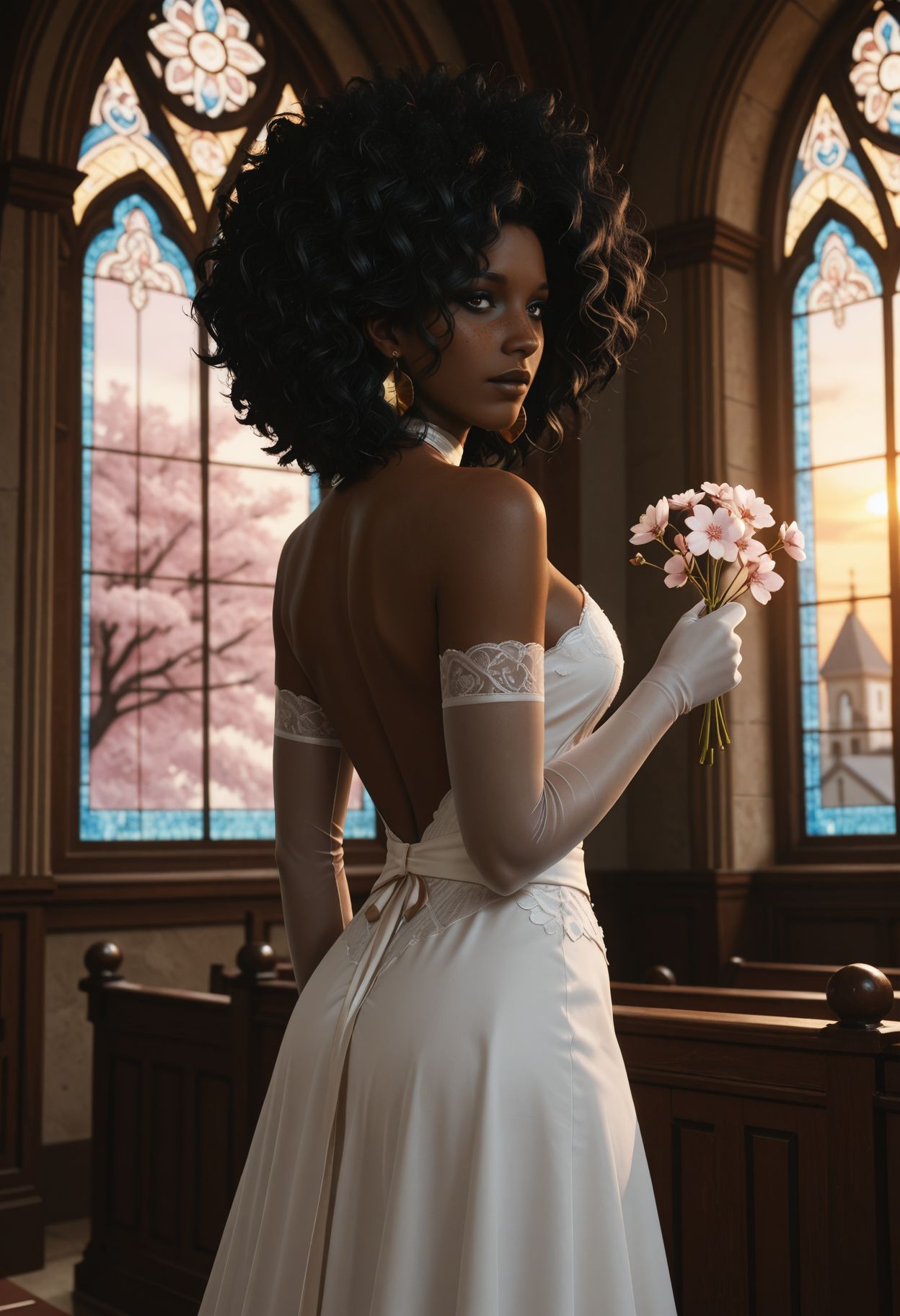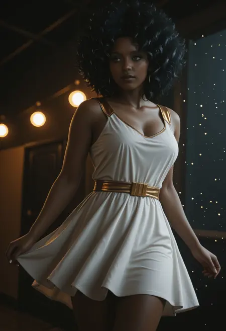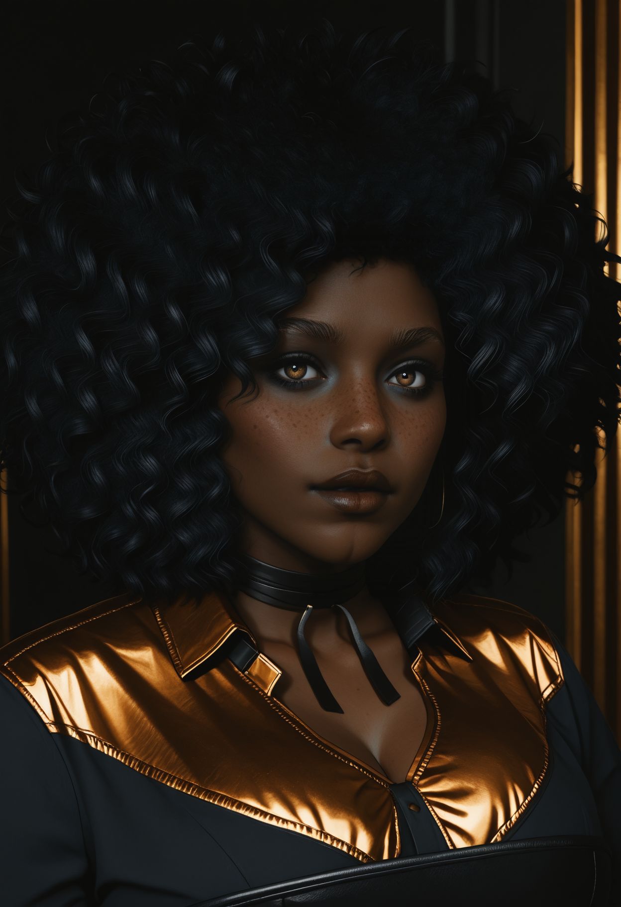 CPD3nny, 1girl, dark-skinned female, black hair, afro, freckles, loop earrings