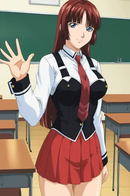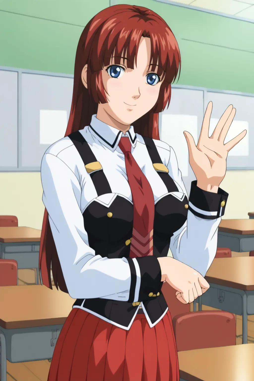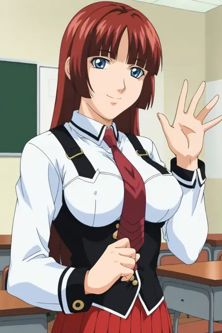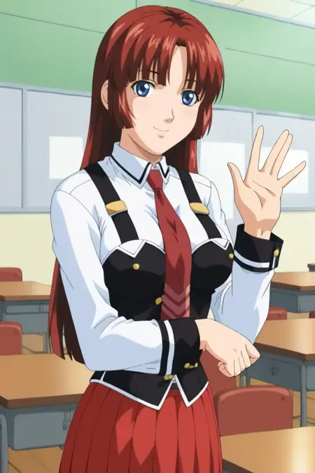 红色领带,白色长袖衬衫,黑色袖口配白色镶边,胸部,校服,黑色背心,红色百褶裙配黄色镶边,