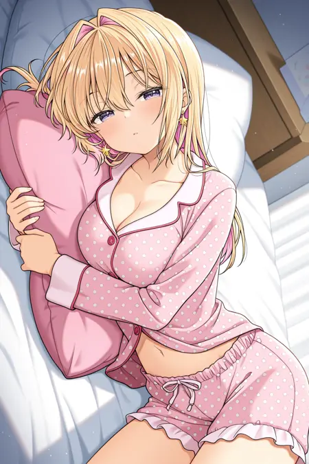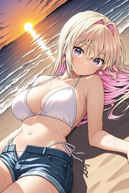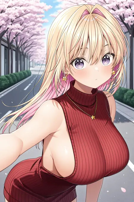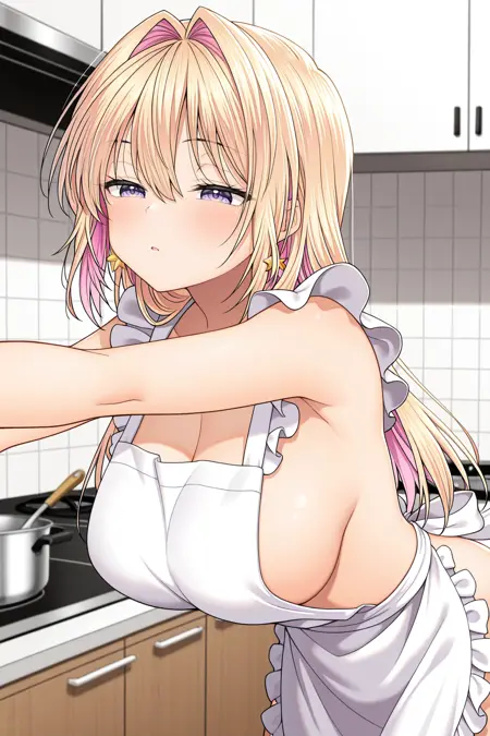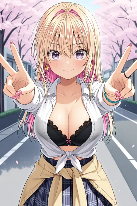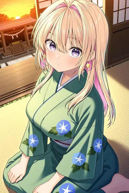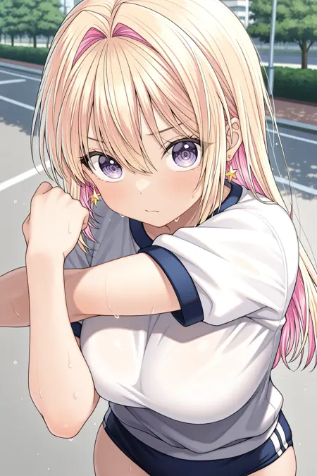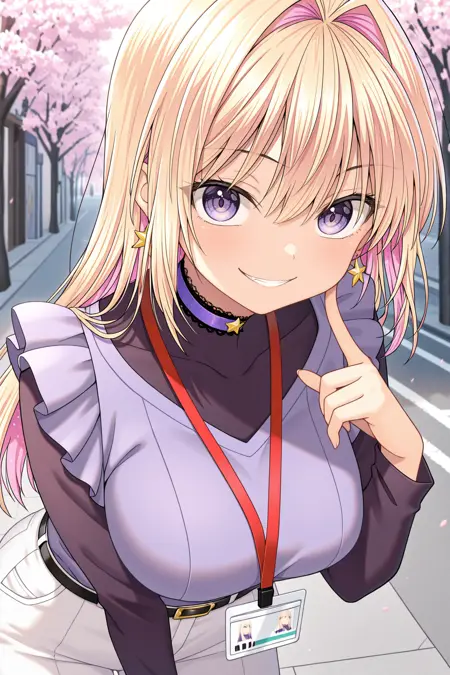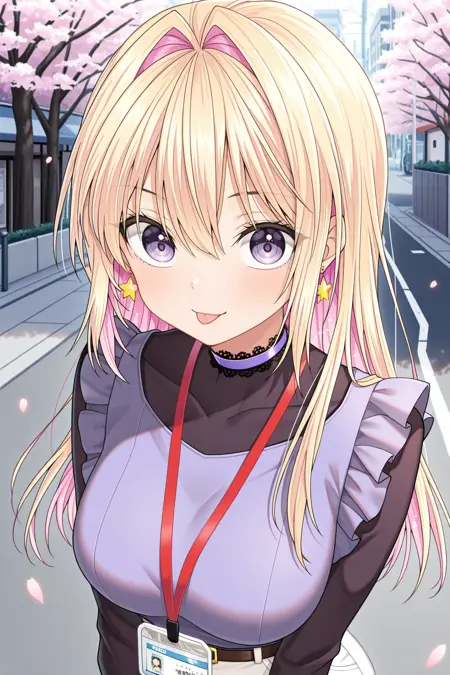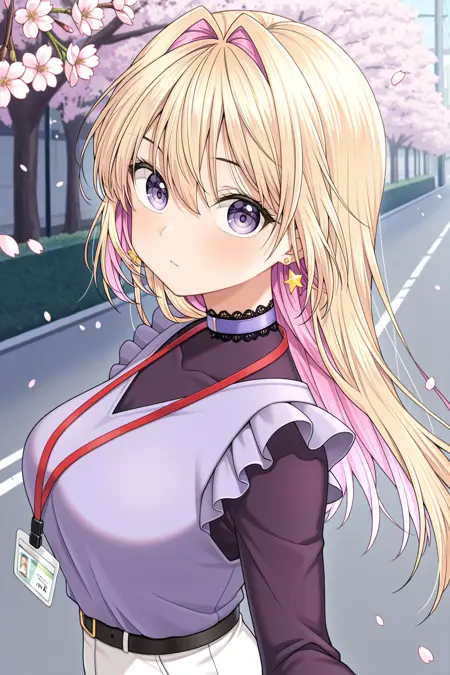 kannawa azusa, 金髪, 色付きの内毛, 星のイヤリング, 星(シンボル), 青いストライプ, 直毛, 目の間に髪, ジュエリー, 長い髪, ピンクの髪, 紫の目,
