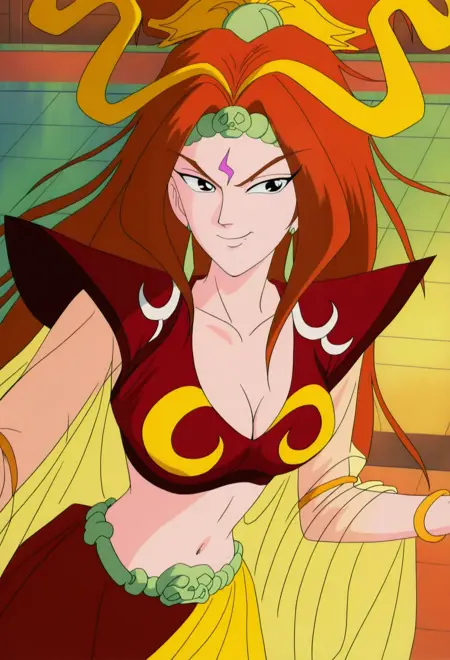 | Trained Words | DaJi,1girl,solo,black eyes,red hair,long hair,facial mark,forehead mark,Copied! DaJi outfit,cape,midriff,navel,earrings,jewelry,headband,crown,cleavage,yellow dress,bracelet,Copied! 请为我的作品点赞👍,谢谢/Please give my Lora a thumbs up 👍,Thank you.Copied! |
