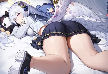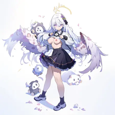 (Blue_Azusa, long hair, white hair, bangs, hair between eyes, purple eyes, wings, halo, hair ornament, jacket, shirt, skirt, uniform, shoes, stuffed animal),
